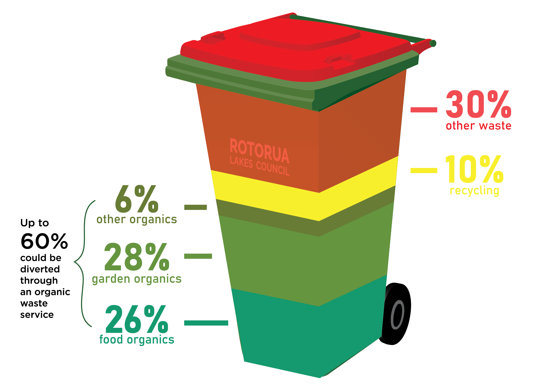 Organic waste makes up over 60% of Rotorua’s household waste, which could be diverted from landfill. The average household in Rotorua puts about 350 kg of organic waste in their red-lid rubbish bins every year, totalling about 10,000 tonnes per year across Rotorua. This food and garden waste has the potential to be processed, to significantly reduce the amount of greenhouse gases produced from the city’s waste by up to 11,000 tonnes of environment-damaging methane.